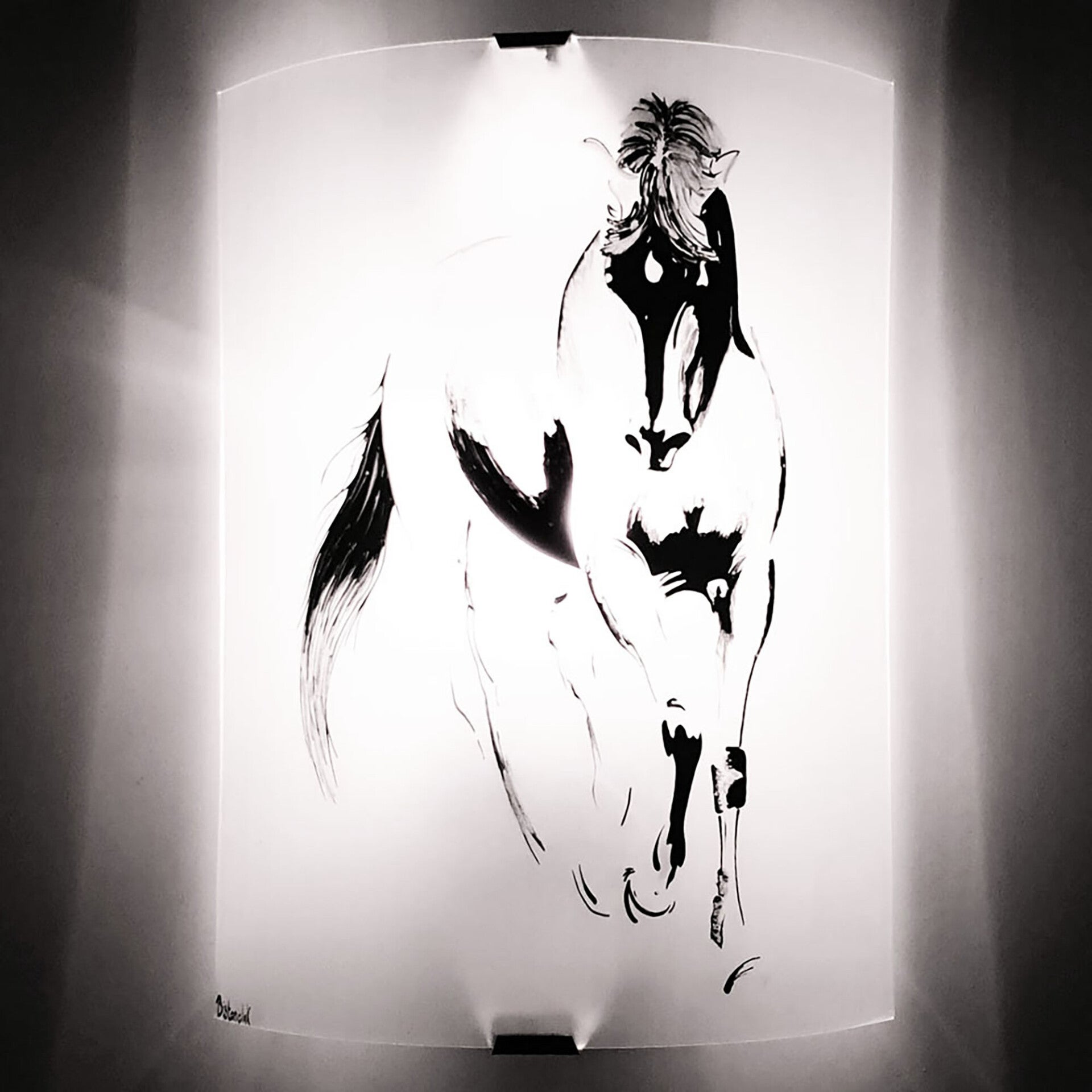 Cette applique murale blanche de création artisanale présente un dessin délicat et précis d'un cheval sur un fond blanc incolore. Le motif noir du cheval a été peint à la main avec une plume pour conserver son aspect légèrement abrupt, essentiel pour maintenir sa vivacité et son énergie. Bien que minimaliste, cette esquisse demeure fidèle à la réalité, elle provient des études anatomiques du célèbre Léonard de Vinci sur les chevaux, ce qui lui confère une valeur historique et culturelle, attirant ainsi les passionnés d'art équestre ou les admirateurs du grand maître italien.