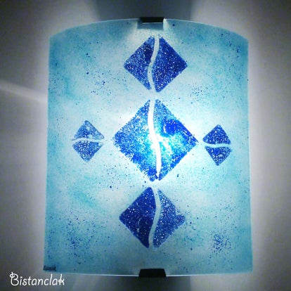 Cette applique murale en verre est colorée d'un bleu turquoise léger et aérien, contrastant élégamment avec des losanges d'un bleu cobalt intense qui accentuent le jeu de lumière et de couleur. Cette applique artisanale se distingue par un design résolument moderne, combinant des lignes géométriques nettes et une esthétique minimaliste. Son allure repose sur la répétition de formes simples et harmonieuses, où les losanges occupent une place centrale.