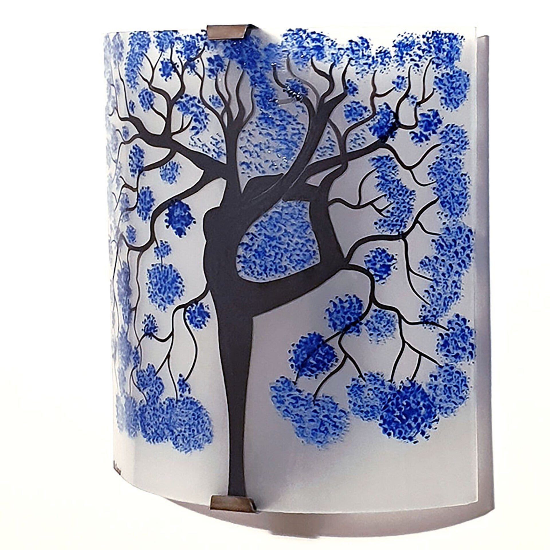 Cette applique murale décorative blanche est ornée du motif de l'Arbre Danseuse avec son feuillage bleu cobalt. Ce luminaire artisanal en verre peint à la main présente le gracieux motif d'une danseuse qui semble se transformer en un arbre élégant, ou peut-être un arbre se métamorphosant en danseuse.
