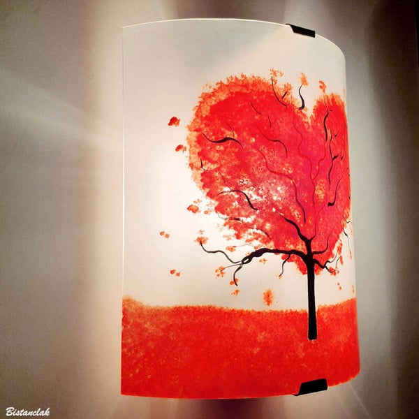 Luminaire artisanal, cette applique murale décorative en demi-cylindre représente le motif d'un arbre au feuillage coloré de rouge en forme de coeur sur un sol d'herbes rouges. Le fond est dépoli par sablage sur la face interne, conférant cet aspect blanc au verre initialement transparent et incolore. La face exposée conserve ainsi l'aspect brillant du verre.