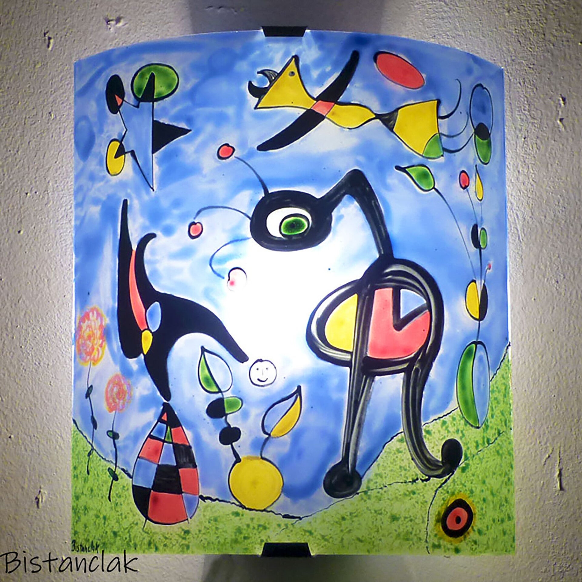 Applique artisanale, cette lampe murale multicolore est une adaptation lumineuse du tableau "Garden" d'après Joan Miro, illustré de personnages fantaisistes et multicolores évoluant dans un jardin surréaliste. Sur un fond bleu hétérogène et un sol d'herbes vertes, elle représente deux personnages en noir et en couleur, typiques de Miro et de son univers pictural audacieux avec l'utilisation de couleurs franches, du rouge, du jaune, du bleu et du vert, autour desquels s'agitent fleurs, oiseaux et formes diverses et courbes toujours très colorés.