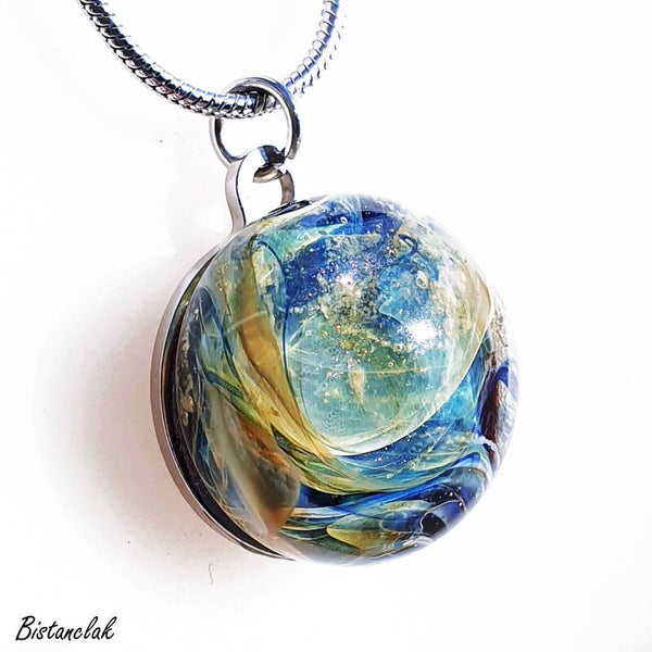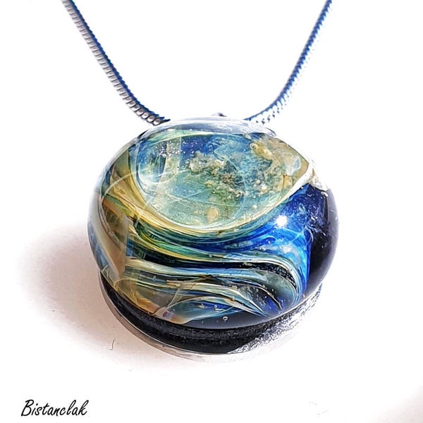 Ce pendentif cabochon en verre est une création artisanale en verre filé au chalumeau par nos soins. C'est une pièce unique.