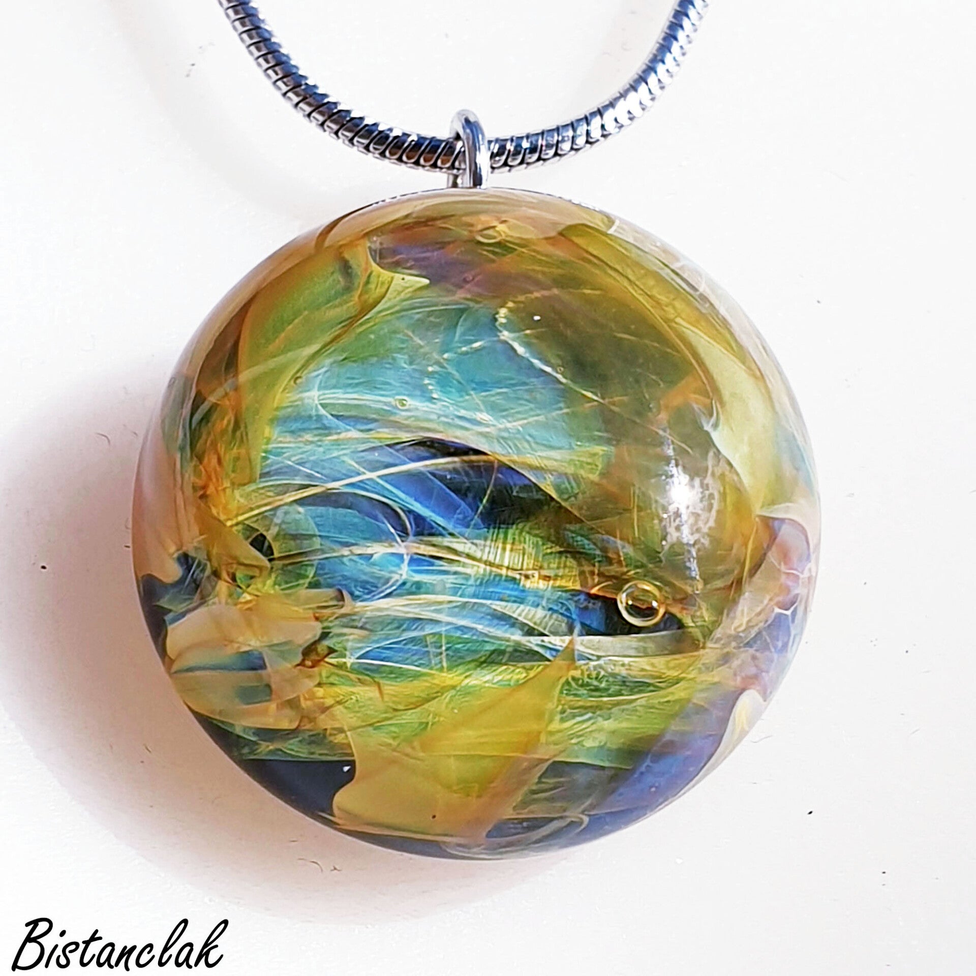 Ce pendentif est un cabochon en verre coloré, la couleur dominante est proche d'un jaune moutarde formant des stries, avec des lignes bleutées en son centre.