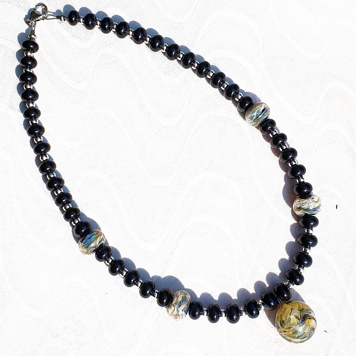 Ce collier artisanal est composé de perles de verre noir réhaussé par quatre grosses perles de verre aux nuances de beige et de bleuté et par un cabochon central renfermant sous son dôme de verre un entrelac de beige et de bleuté diffus.
