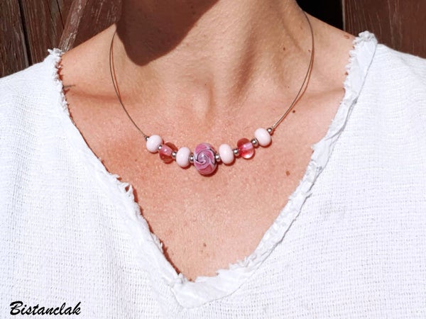 Ce collier de perles de verre filé est un ras de cou dont le pendentif central est une perle de verre décorée du motif d'une fleur en spirale rose pastel et rose soutenu, encadrée de perles plus petites alternant le rose pastel opaque et le rose soutenu transparent. Les perles sont séparées entre elles par de petites perles en acier. L'ensemble est monté sur un fil câblé et maintenu sur le devant du cou.