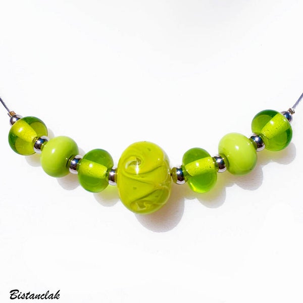 Ce bijou artisanal de couleur vert acidulé est un collier ras de cou en perles de verre filé. Il est orné d'une perle centrale décorée du motif d'une fleur en spirale de couleur vert souenu, encadrée de perles de verre coloré plus petites alternant le vert pomme acidulé transparent et le vert petit-pois opaque. Les perles sont séparées entre elles par de petites perles en acier. L'ensemble est monté sur un fil câblé et maintenu sur le devant du cou.