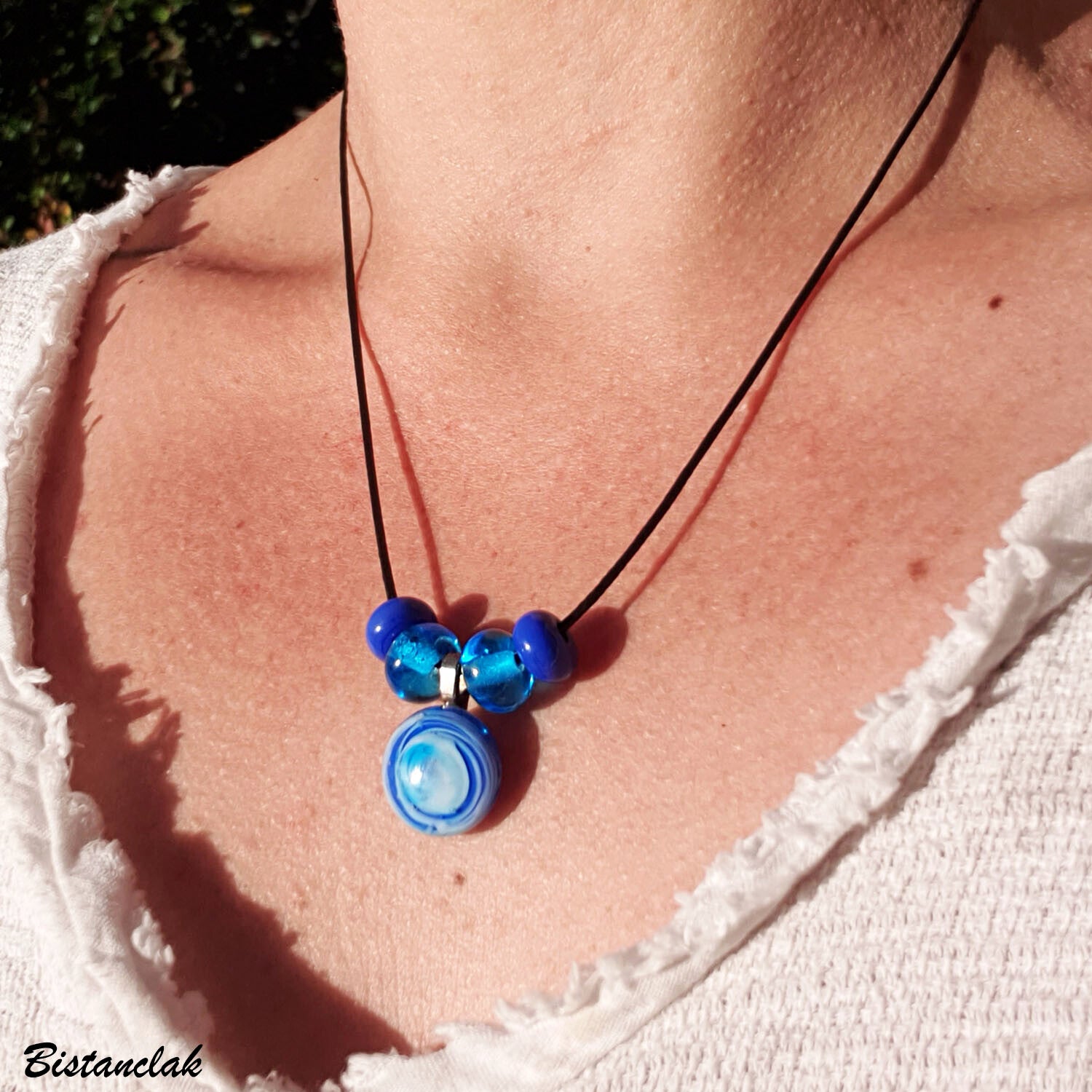 Ce collier simple en verre bleu est composé de perles de verre coloré turquoise transparent et bleu lapis opaque encadrant un pendentif cabochon central coloré d'un joli chamarré tourbillonat de turquoise, bleu lapis et blanc. L'ensemble est monté sur un cordon synthétique noir avec fermoir acier. Garantie sans nickel.