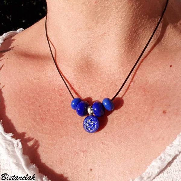 Ce bijou à pendentif central est un collier moyen composé de perles en verre coloré bleu roi et bleu lapis encadrant un petit cabochon bleu roi légèrement pailleté. L'ensemble est monté sur un cordon synthétique noir avec fermoir acier. Garantie sans nickel.
