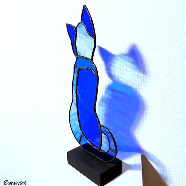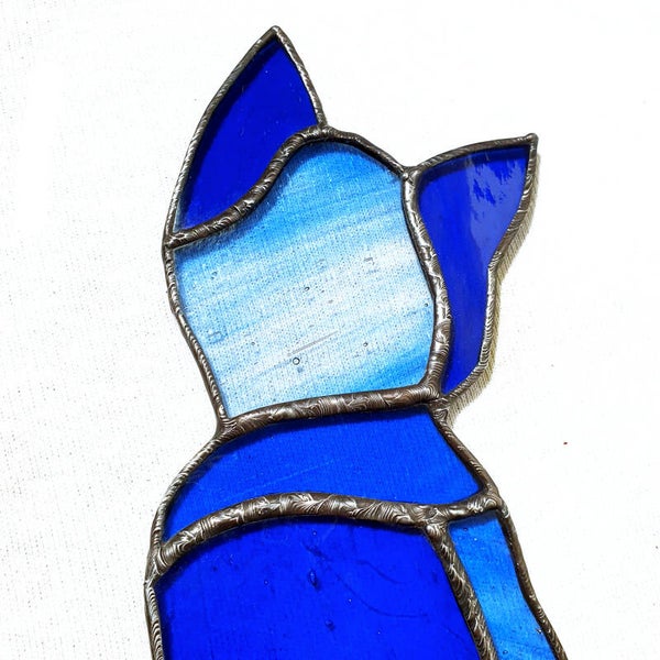 Cette décoration vitrail en forme de chat est composée de trois teintes de verres bleus translucides. Ses oreilles et une partie de son corps sont en verre bleu cobalt, le haut de ses épaules et une partie de sa queue en verre bleu lapis, tandis que l'autre partie de son corps, sa tête et le bout de sa queue sont en verre coloré d'un chamarré clair d'incolore strié de bleu.