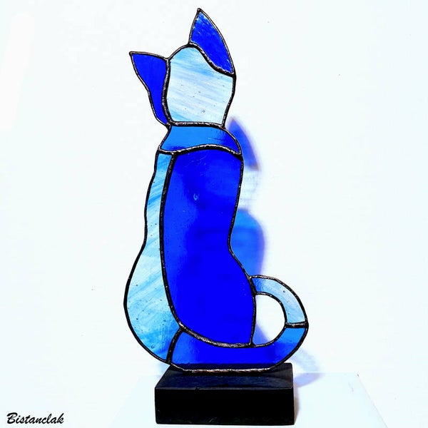 Cet objet vitrail bleu représente un chat de dos, assis, sa queue lovée revenant sur le devant. Il est composé de différentes teintes de verres bleus translucides : cobalt, lapis et un chamarré de clair et de bleu.